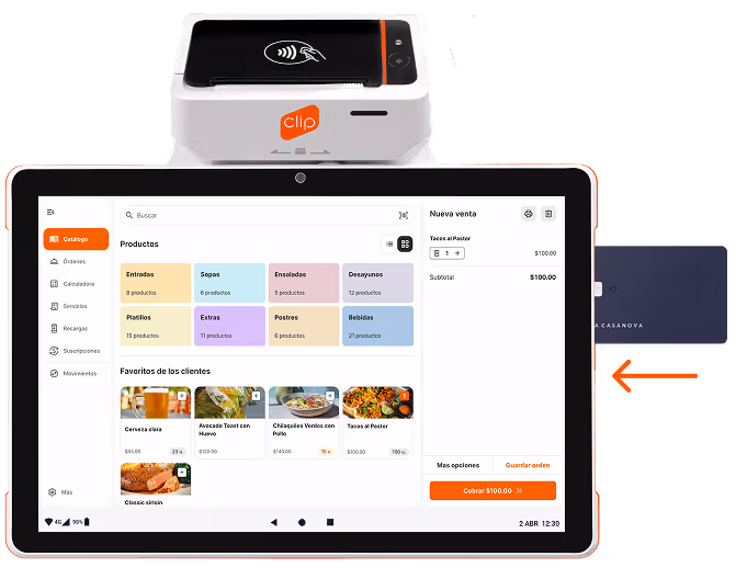Clip Stand 2 acepta todas las tarjetas de débito, crédito y vales respaldadas por Visa, Mastercard y American Express. Puedes realizar cobros con tarjetas de chip, banda magnética y contactless.